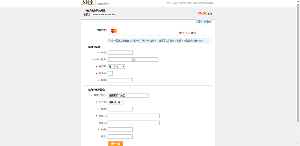 我選擇以Master Card付款,以下是支付畫面,系統是支付寶,如果有疑慮,可以取消。